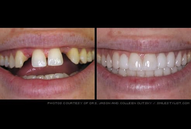 A combination of dental techniques can be used to achieve a great smile. Here, porcelain veneers and crowns correct crooked teeth, an uneven gum line, and other chipped, worn, and discolored dentistry. While cosmetic dentists can make a dramatic difference in a person's smile and overall oral health, the work must be carefully planned -- though for many the elaborate and costly production is worth it in the end.