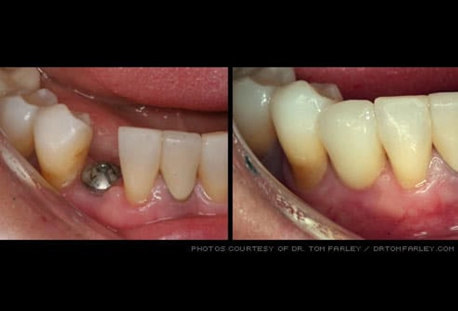 Millions of Americans suffer tooth loss, mostly due to tooth decay, gum disease, or injury. Dental implants -- replacement tooth roots which are made of titanium (shown at far left) -- provide a strong foundation for the attachment of permanent or removable artificial teeth (crowns). Instead of individual crowns, some patients may have attachments on their implant that support a removable denture.
